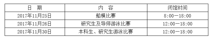 全校师生、广大游泳爱好者: 因学校近期在游泳馆举办比赛活动,比赛期间,游泳馆闭馆。具体闭馆时间如下: