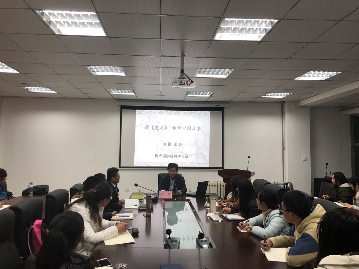 11月27日晚18:30,由我院中国传统文化研究所举办的“海大国学经典讲习会”在马克思主义学院210会议室正式开讲。开云电竞网址党委宣传部部长、著名文史专家陈鷟教授应邀作了首场题为《读<史记>,学讲中国故事》的主题讲座。本场讲座由我院中国传统文化研究所陆信礼老师主持。前来聆听的有马院师生及我校其他单位热爱传统文化的师生。