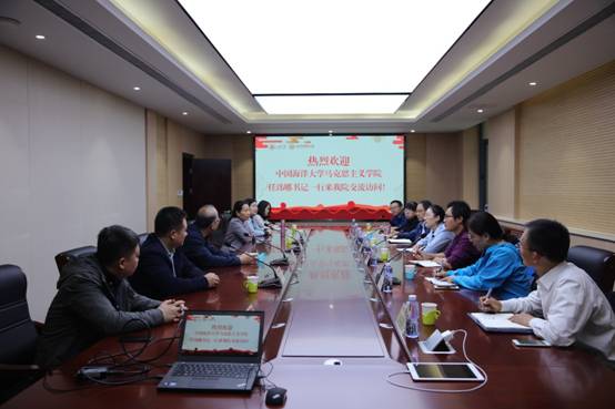 山东师范大学马克思主义学院于2016被确定为山东省第一批重点马克思主义学院,2019年7月入选第三批全国重点马克思主义学院。山东师范大学马院党委书记吕晓勇、院长王增福、副院长徐稳、史家亮、工会主席胡保华及教研部负责人等参加了交流座谈。吕晓勇首先对调研组一行表示热烈欢迎。王增福从办院历史、系部设置、办公场所、师资力量、平台建设以及学科建设等方面对山东师范大学马院的发展建设情况进行了详细介绍。随后,吕晓勇进一步重点介绍了人才引进方面的创新举措;徐稳介绍了思政课教学改革、实践教学、考试评价体系改革及教师能力提升等方面的经验做法;史家亮介绍了马克思主义理论人才培养方面的经验做法。胡保华、吴春雷、于光胜介绍了形势与政策、马克思主义基本原理概论和研究生思政课的开展情况。任玮娜代表调研组对山东师范大学马院的热情接待表示感谢,并简要介绍了海大马院在学科建设、教学改革以及人才队伍建设等方面的基本情况。座谈会后,调研组一行还参观了山东师范大学新建的思政课虚拟仿真实验室。