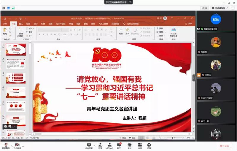●10月17日,青年马克思主义者宣讲团程颖以“请党放心,强国有我——学习贯彻习近平总书记‘七一’重要讲话精神”为主题,为管理学院进行线上理论宣讲。