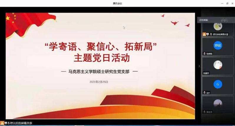 2月25日晚上,马克思主义学院硕士研究生党支部开展以“学寄语、聚初心、拓新局”为主题的线上主题党日活动,激励支部党员干事热情和昂扬斗志,以更好的姿态奋进2021,更好发挥先锋模范作用。学院党总支副书记、副院长王付欣参与观摩本次活动。