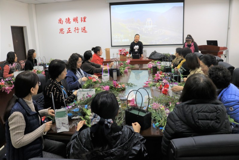 活动现场欢声笑语、花香四溢。专业花艺师向大家讲解了插花原则方法,示范了花枝修剪、色彩搭配等技艺后,老师们以饱满的热情投入到插花创作中。插花过程中,老师们一言一语讨论着自己的插花理念,互相借鉴学习。在花艺师的指导下,老师们纷纷发挥自己的创意,通过灵巧的双手和精妙的组合,将百合、康乃馨、满天星等花枝拼插出一盆盆造型别致、独具匠心的花艺作品,呈现出别样的美丽。大家脸上洋溢着满意幸福的笑容,并纷纷与自己的作品合影留念。