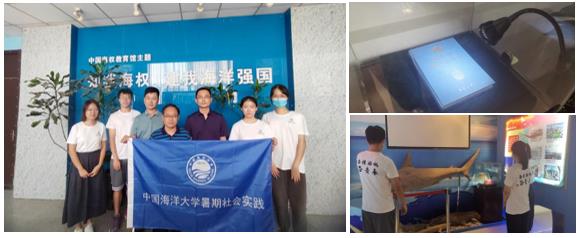 7月29日,实践团队来到中国海权教育馆进行实地参观调研。海权教育馆主要包括中国海洋权益沙盘展示、海洋资源实物展示、海权教育电影院以及海洋海权教育展览等四个部分。馆内以沙盘、实物、图文展板、多媒体声光电和交互体验为展示方式,给实践队员带来了耳目一新的感官体验。实践队员杜兆阳感叹道:“海洋意识教育不仅仅只能发生在课堂上,我们还要不断探索创新海洋意识教育的新载体与新的活动形式。”