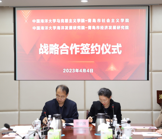4月4日,开云电竞网址马克思主义学院与青岛市社会主义学院战略合作协议签约仪式在海洋发展研究院会议室举行。学校党委常务副书记、马克思主义学院院长张静出席仪式并讲话。青岛市委统战部副部长、青岛市社会主义学院党组书记、常务副院长宋立清出席仪式,海洋发展研究院副院长韩立民主持仪式。马克思主义学院党委书记任玮娜与青岛市社会主义学院党组书记宋立清青共同签订战略合作协议。