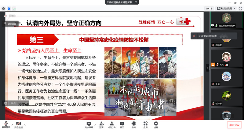 3月21日上午,马克思主义学院教工第二党支部和研究生党支部组织开展线上师生集体备课会,就如何阐释好、宣传好习近平总书记关于疫情防控工作的重要讲话精神开展专题研讨。学院党委书记任玮娜,学院副院长王洪兵,党委副书记、副院长王付欣,学院教工第二党支部部分教师党员和研究生“青年马克思主义者”宣讲团成员参加会议。
