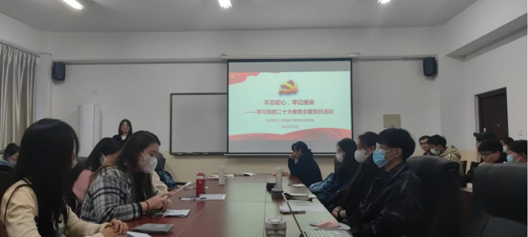 为深入学习贯彻党的二十大精神,11月23日下午,马克思主义学院硕士研究生党支部开展“不忘初心、牢记使命——学习党的二十大报告”主题党日活动。本次活动由党支部书记曲孟琳主持,支部全体党员参加学习。