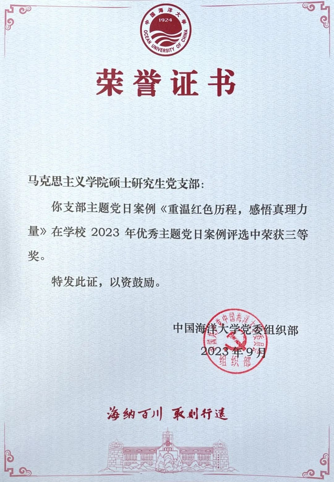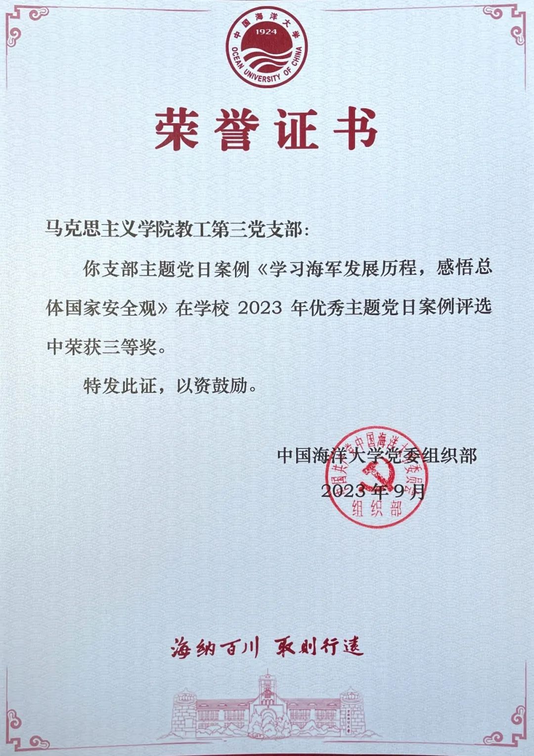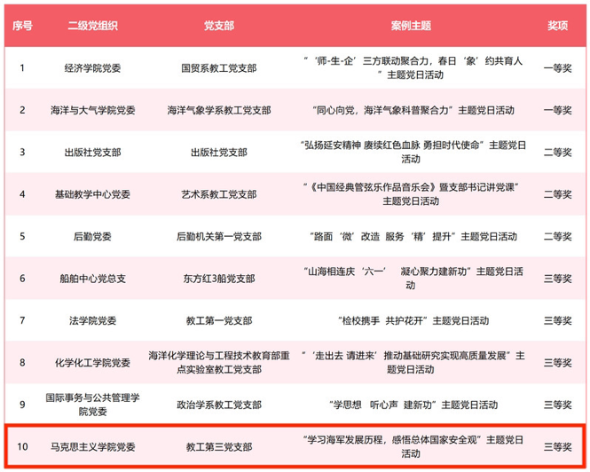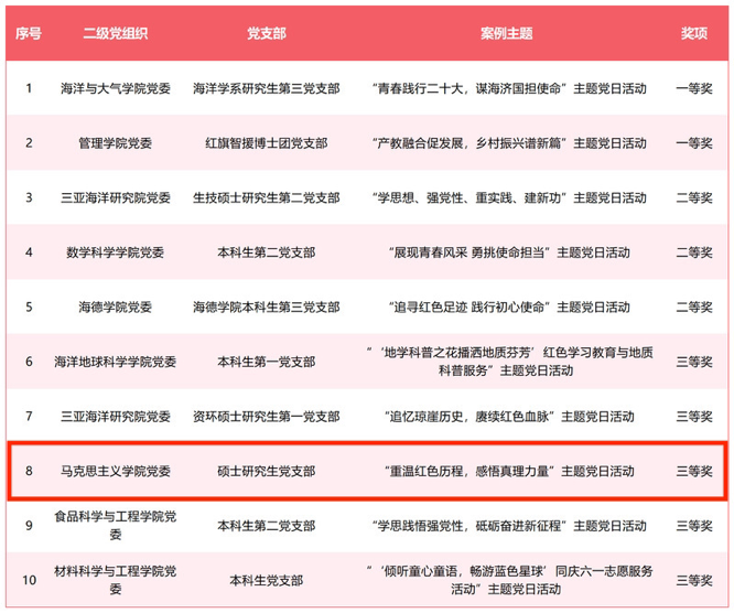 为学习贯彻习近平新时代中国特色社会主义思想,进一步加强党员队伍教育管理和严格党内组织生活,持续增强党支部的政治功能和组织功能,学校组织开展2023年优秀主题党日案例创建评选活动。由马克思主义学院党委推选的主题党日案例在43个案例中脱颖而出,分别荣获教工组三等奖、学生组三等奖。