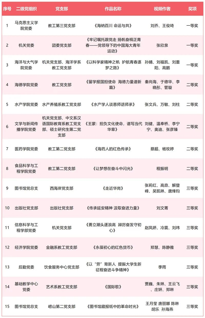 其中,学院教工第三党支部作品《海纳百川 命运与共》结合新时代的青岛实践讲述人类命运共同体理念,阐释人类命运共同体理念中蕴含的中华优秀传统文化底蕴与科学理论依据,获教工组一等奖,将被纳入学校党员教育课程库,作为入党教育培训课程。学院硕士研究生党支部《乘“五月的风”激扬青春力量》获学生组二等奖。学院教工第二党支部作品《中国共产党的诞生,为什么要从“五四”开始讲》入选中组部“党课开讲啦”精品党课展播。