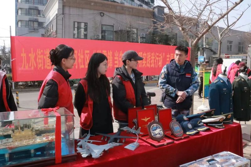 团员青年汪书香结合自身大学生退伍军人的特殊经历,跟随筑梦深蓝讲师团的成员向居民进行国防教育普及,通过对一个个精美模型的讲解,带领居民们回顾了中国人民海军艰苦奋斗、奋勇向前的伟大征程,讲述了人民海军向海图强,走向“深蓝”的动人故事。