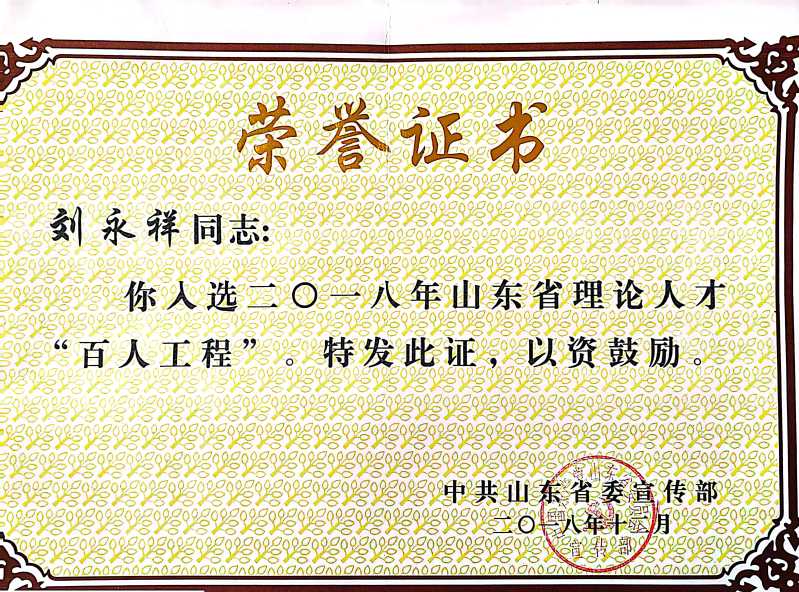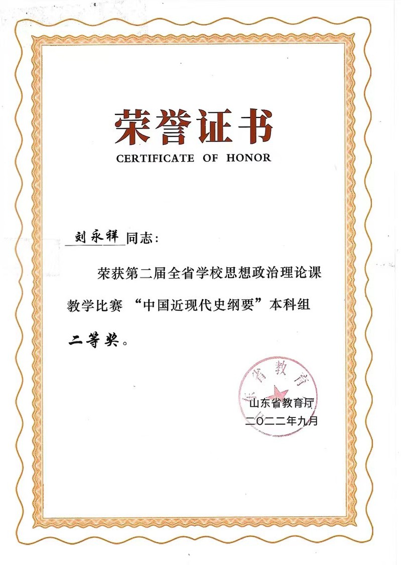 刘永祥副教授获获山东省理论人才“百人工程”优秀理论成果奖,获2022年山东省思政课教学比赛二等奖。