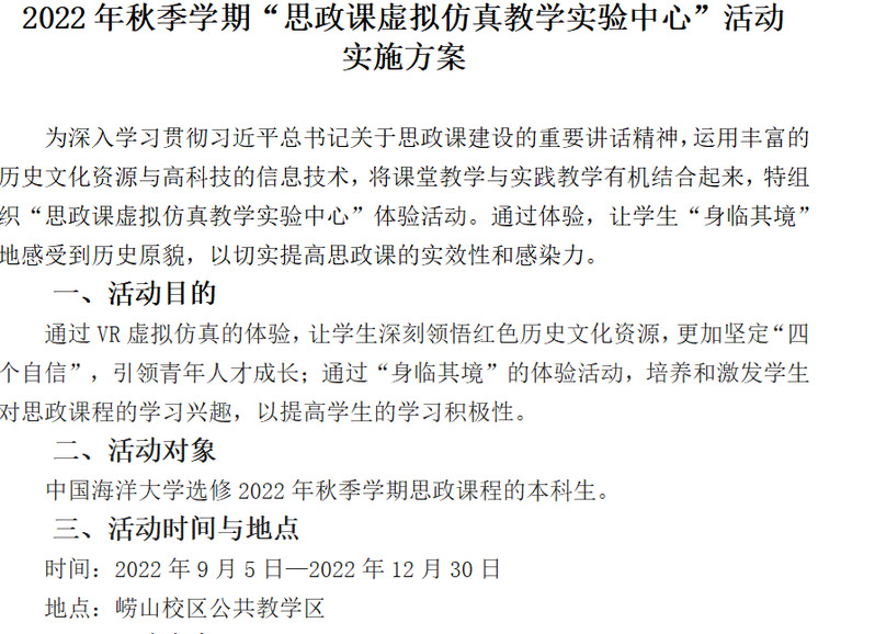 再次,为增强运用丰富的历史文化资源与高科技的信息技术,将课堂教学与实践教学有机结合,从2023秋季学期开始,中国近现代史纲要教研部率先在学院使用“思政课虚拟仿真教学实验中心”用于实践教学。教研部制定了“思政课虚拟仿真教学实验中心”活动实施方案,教师统计班级参与活动的学生(学生自愿报名或分批次),按照每次活动40分钟、不超过24人(包括教师在内)进行统一规划,形成文件表格,向教研部以及实验中心进行报备。在使用过程中,教师组织做好签到、拍照等工作,教师在活动过程中的答疑解惑,让学生“身临其境”地感受到历史原貌。活动结束后,教师选择适当方式,组织学生的感受汇报,并纳入课程平时考核。通过教师统一讲授和学生个人体验相结合,让学生以VR虚拟仿真“身临其境”的形式深刻领悟红色历史文化资源,培养和激发学生对思政课程的学习兴趣和积极性。