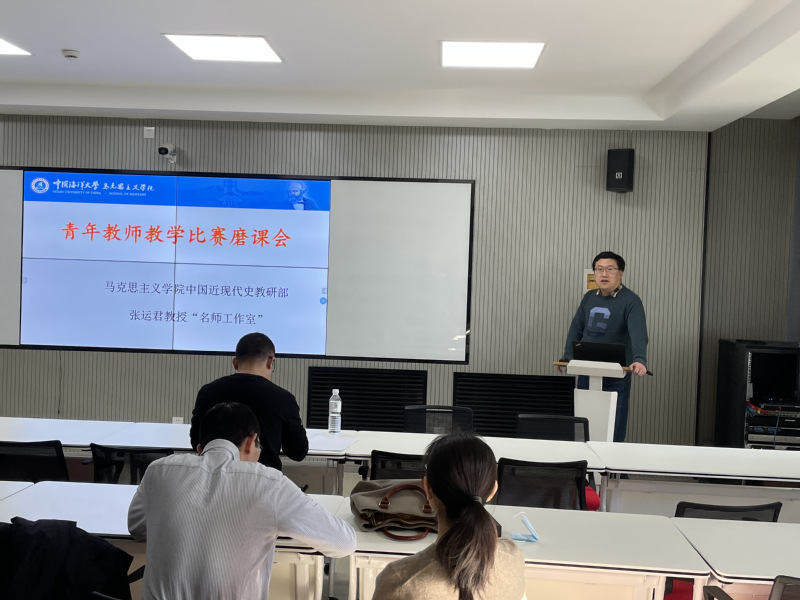 2、中国近现代史纲要教研部联合教育部名师工作室——张运君教授名师工作室举行青年教师教学磨课会,参照山东省和青岛市思政课教学比赛的形式,以教研部骨干教师为评委,青年教师根据抽签准备一个时长10或15分钟的完整的教学单元进行展示,评委进行点评,提出改进建议,为青年教师参加省市思政课教学比赛提前做好准备。