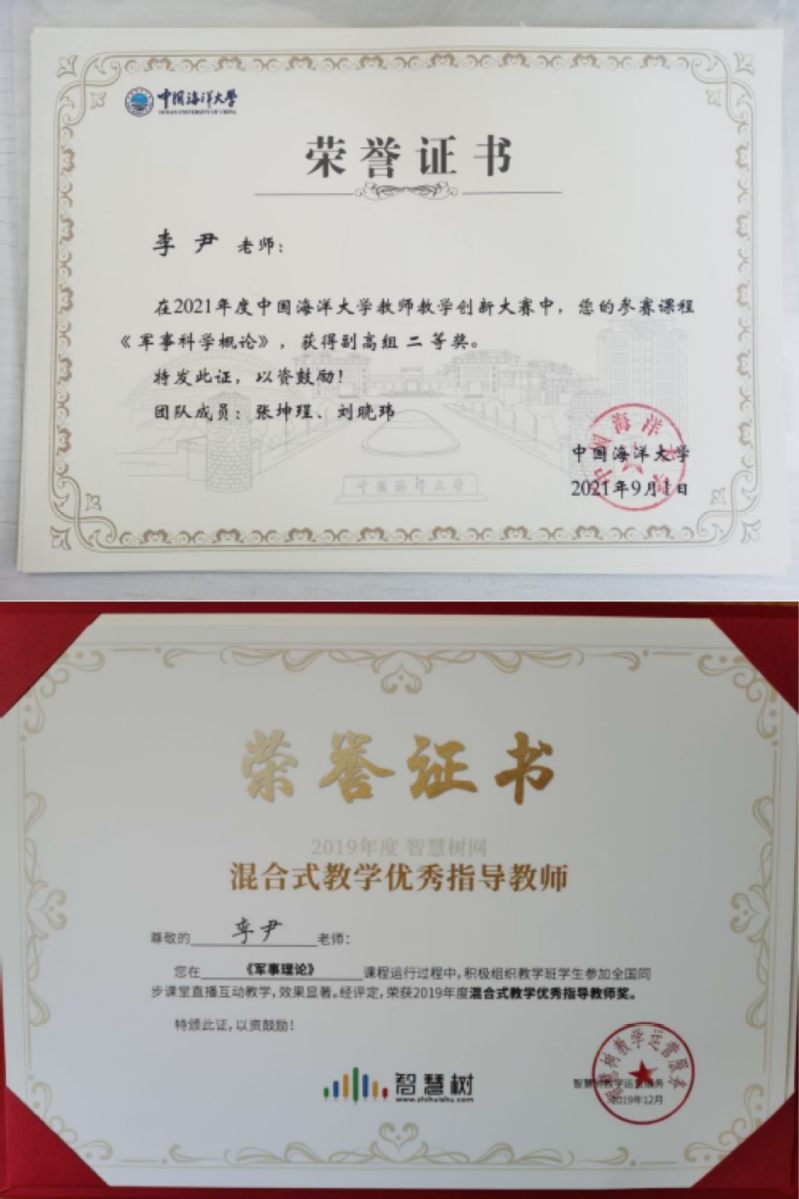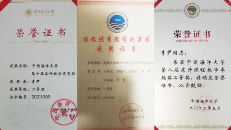 教学团队成员主持海洋权益方向的国家社科基金项目和教育部人文社科基金项目10项、全国古籍整理委员会直接资助项目1项,同时参与多项海洋方向的国家社科基金重大招标项目、重点项目和一般项目。教学团队成员还主持学校公共基础课程教学改革与课程建设项目、本科教育教学研究项目6项,指导学生展开本科生研究发展计划6项,发表教学论文、研究报告多篇。教研成果“海权文化特色军事理论教育体系的构建”获校级优秀教学成果一等奖,4位教师在学校本科教学评估中获评“优秀”等级。教师作为第一作者发表核心期刊论文30余篇,《在军事理论教育中加强海权海防教育研究》《普及海洋知识,增强全民族的海权观念》等论文获全国普通高校国防教育科研论文报告评比一、二等奖。