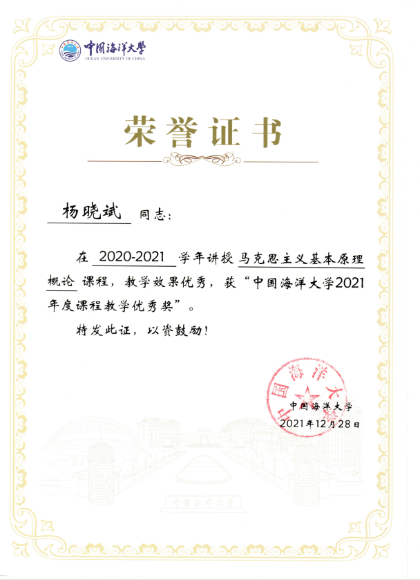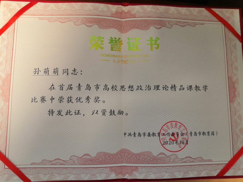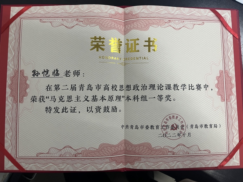 队伍建设方面。课程建设离不开教师发展和队伍建设工作,所以,教研部也积极了采取“一对一”传帮带、教研部互听互评、教学观摩等方式,多措并举地帮助青年教师提升教学水平和教学效果,并取得了不错的成绩。自教研部成立以来,原理教研部老师们获得山东省思政课教学比赛一等奖1名,青岛市思政课教学比赛特等奖1名、一等奖1名、优秀奖1名。另外还有多名教师曾获得学校年度课程教学优秀奖。教研部王凯老师的“马克思主义基本原理”课在参加学校本科课程教学评估中获得优秀等次的好成绩。