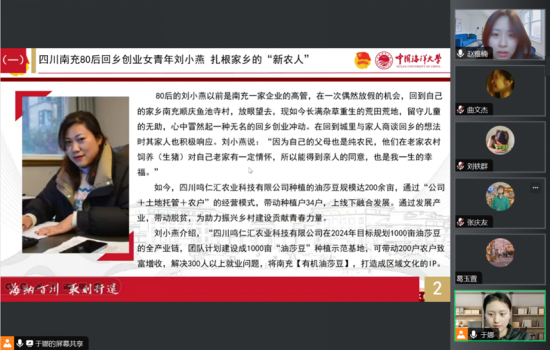 2022级团支部宣传委员赵雅楠组织开展“青年返乡创业,助力乡村振兴”团支部特色活动。赵雅楠介绍了四川南充80后回乡创业女青年刘小燕以及杨起鸿的创业故事,启发团员深入思考新时代青年如何发挥所长,彰显青年在乡村振兴中的积极担当,在新时代干出一番事业,为谱写乡村振兴新篇章贡献青春力量。