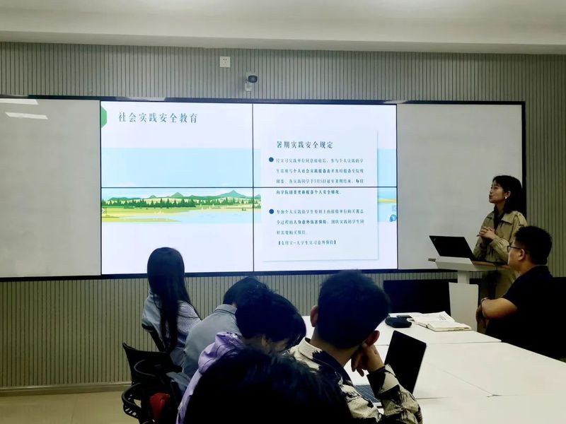 会议伊始,辅导员刘珂曼从团队实践、个人实践、专项实践三个方面详细介绍本年度学校暑期社会实践工作安排,鼓励同学们积极响应学校号召,认真制定暑期实践计划,在社会实践中增长才干。随后,刘珂曼向同学们展示了往年社会实践优秀案例,着重介绍了团队实践流程,讲解了宣传稿件和实践报告撰写的要求,并对同学们进行了社会实践安全教育,提醒学生在暑期实践期间要及时报备安全情况。