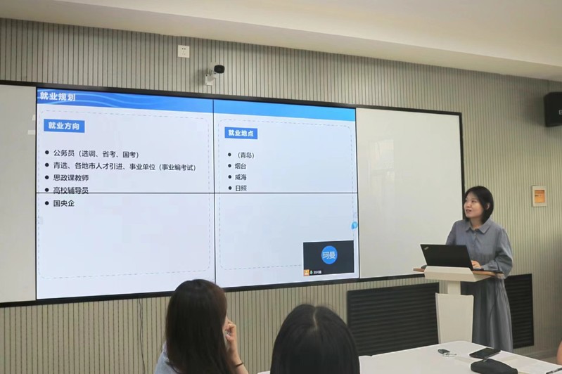 最后,党委书记任玮娜作总结发言。她指出,马院学子多数在山东就业,要认真学习领会习近平总书记考察山东重要讲话精神,以习近平新时代中国特色社会主义思想为指引,实干担当、锐意进取,将自身职业规划同强国建设、民族复兴的宏大目标结合起来,将“小我”成长融入“大我”奋斗,以奋发有为的姿态推动谱写中国式现代化山东篇章。任玮娜强调,同学们要充分认识到就业形势的严峻性,一方面要不断调整就业定位和预期,另一方面也要积极提升就业竞争力,提升以专业素养为核心的综合能力,做有理想、敢担当、能吃苦、肯奋斗的新时代好青年。