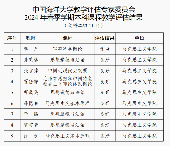 近日,学校公布了2024年春季学期学校本科课程教学评估结果。经过评估专家长达一个学期随堂听课、调阅教学档案、发放调查问卷、深入学院了解情况等环节的综合评定,学院李尹老师所讲授课程获评本科课程教学评估优秀,孙艺格、张吉舜、贾岱铮、曹晟旻、孙恺临、李鸽、连雪晴、许欢8位老师讲授的课程获评良好。