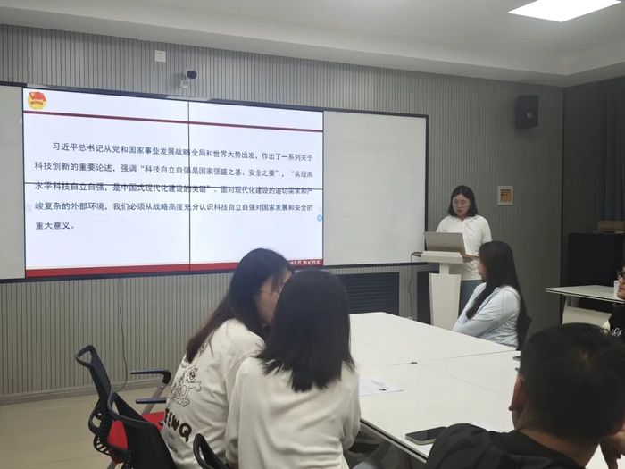 2022级团支部成员们在会前组织自学了《深入学习习近平关于科技创新的重要论述》,并在会上集中学习了党建网发布的《要时不我待推进科技自立自强》一文,团支部书记于娜结合以往特色主题团日活动中的科技先锋模范,围绕“当代青年身上肩负着哪些推动建设科技强国的重任?”这一主题,组织团员和青年展开讨论,进一步引导支部团员明确肩负的重任,鼓励团员增强自主创新能力,争取在推动科技强国建设、实现高水平科技自立自强中争当主力军。