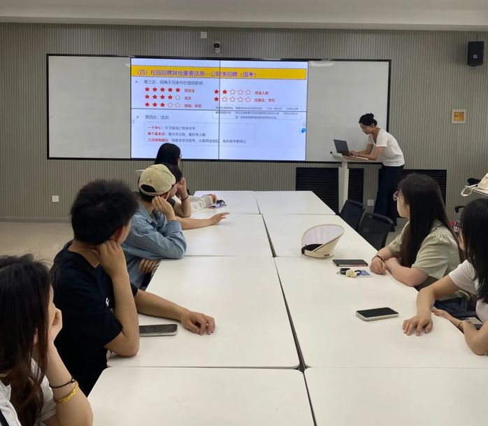 2022级马克思主义理论团支部书记于娜以学院上一届毕业生就业数据为切入点,围绕考研、留学、就业、考公考编等不同职业发展路径进行了逐项讲解,针对征兵入伍、西部计划、“三支一扶”等就业渠道进行了政策解读,引导同学们深入了解当前就业形势和相关政策,动员大家尽快明确就业目标,紧跟国家经济发展的需要寻找工作机会。