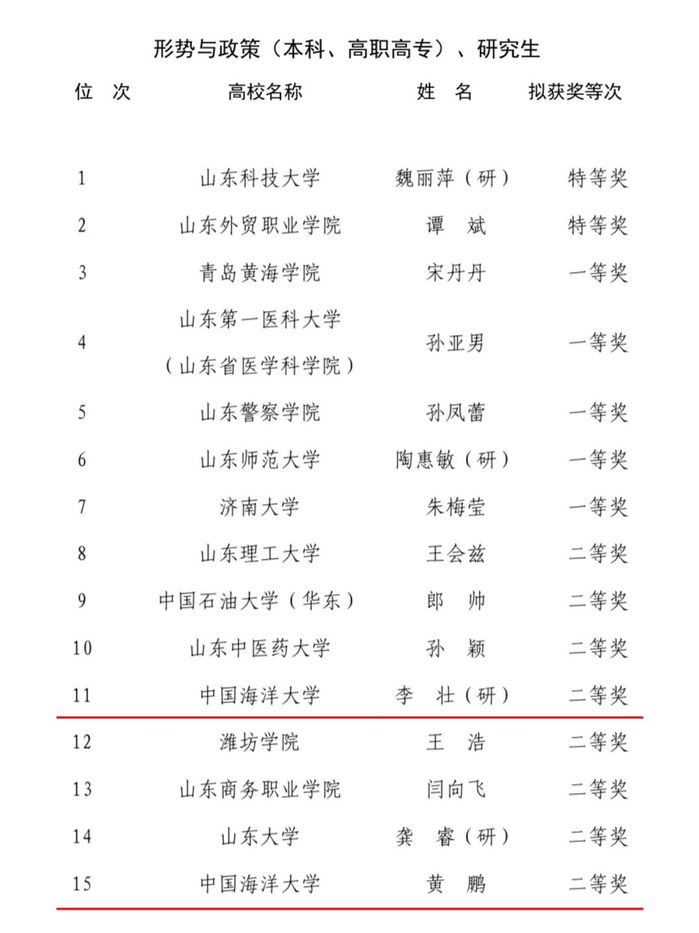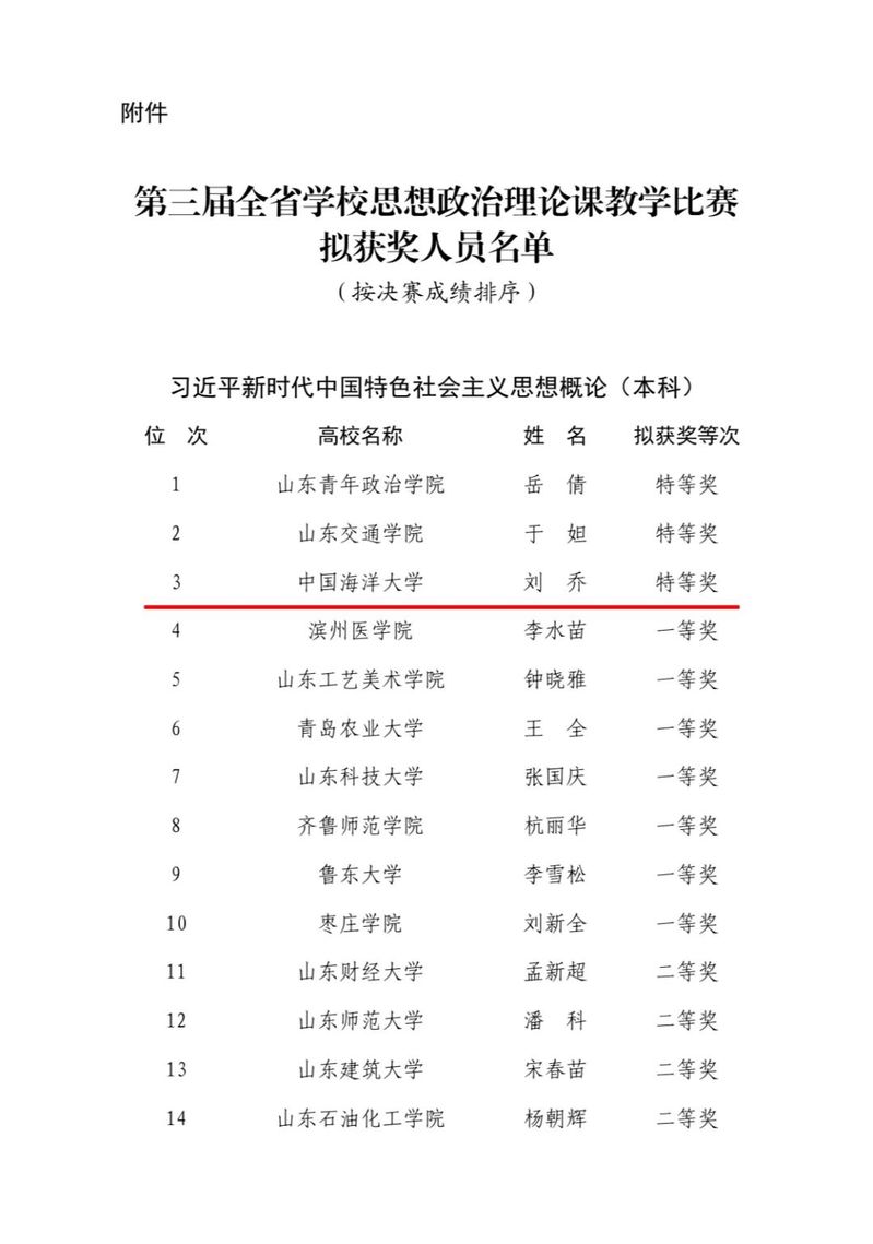 近日,山东省教育厅公布第三届全省学校思想政治理论课教学比赛结果,马克思主义学院青年教师刘乔获“习近平新时代中国特色社会主义思想概论(本科)”组特等奖,李壮、黄鹏获“形势与政策(本科、高职高专)、研究生”组二等奖,获奖数量创学校参加此项比赛的最好成绩。