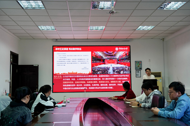 会议第二项,马克思主义学院硕士研究生党支部副书记尚明治以“百年忆史厚德,笃志勤学致远”为题开展理论宣讲,带领全体党员从救国之梦、兴国之基、强国之路三个篇章,共同回顾海大的办学历程和杰出校友先进事迹,展示了学校在百年历史征程中的不懈奋斗和卓越贡献,引导全体党员深刻领会海大的文化底蕴和精神内涵,进一步传承红色基因,厚植爱党爱国爱校情怀。与会党员纷纷表示要在实践中将红色基因和光荣传统内化为精神动力,把个人理想融入党和国家事业之中,把个人前途融入中华民族伟大复兴时代洪流中,在新时代立鸿鹄志、做奋斗者,向海奋发图强,谱写蓝色华章。