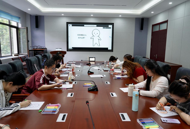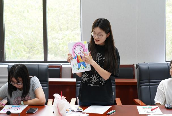 活动伊始,余蓝老师讲解了情绪觉察对身心健康的重要性。随后,在老师的引导下,同学们拿起彩笔绘制属于自己的“情绪小人”,通过画笔具象地感受自己的内心世界。余蓝老师对同学们的画像依次进行解读, 她谈到,情绪小人的颜色、形状和细节都映射了当下的心理状态,而觉察情绪是调节情绪的第一步。
