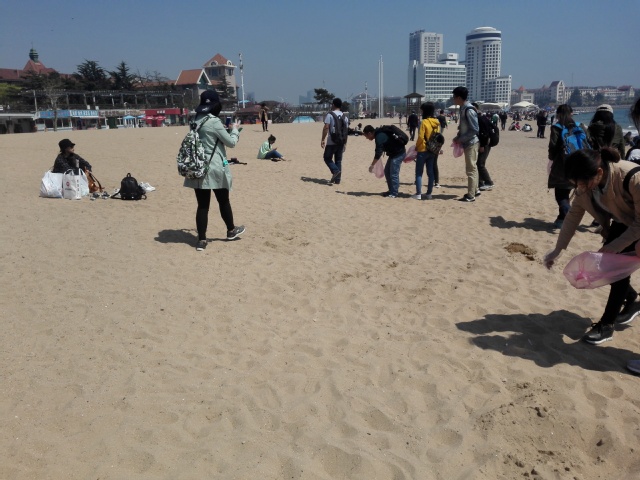 本次活动从出发,途经鲁迅公园,最后到达第一海水浴场。支部成员手持垃圾袋走向海滩,不放过每一个角落,将游客弃置的塑料袋、矿泉水瓶、烟头等逐一拾进垃圾袋。即使是埋在沙滩之中的吸管、竹签之类的垃圾也都被我们捡了起来。一些游客也受到了我们行动的感染,加入到我们的队伍中来。一个多小时以后我们就把沙滩上的垃圾基本清理干净了。
