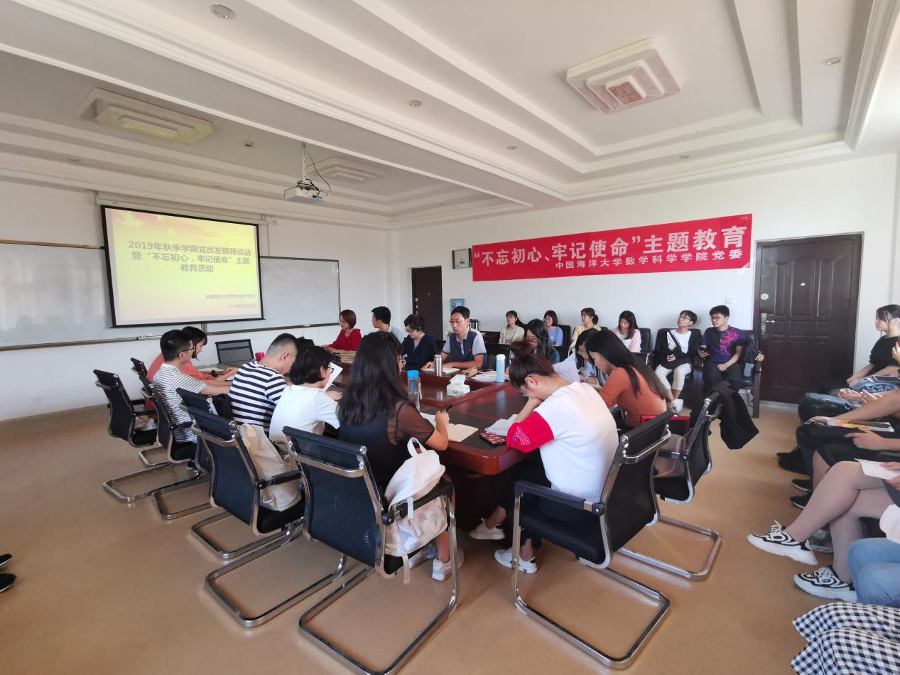 9月25日下午,数学科学学院2019年秋季学期党员发展预谈话暨“不忘初心、牢记使命”主题教育在数学楼424会议室举行。学院党委副书记刘中华、团委书记崔琪、团委老师付聪、团委老师律海伦、学生党支委、入党积极分子出席本次会议,会议由律海伦主持。