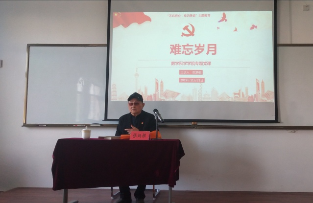 2019年11月21日下午,开云电竞网址数学科学学院邀请86岁高龄的退休老教授张炳根老师在数学科学学院604会议室开展了一场题为“难忘岁月”的主题党课。数学科学学院全体教职工党员和学生党员参加了此次主题党课。