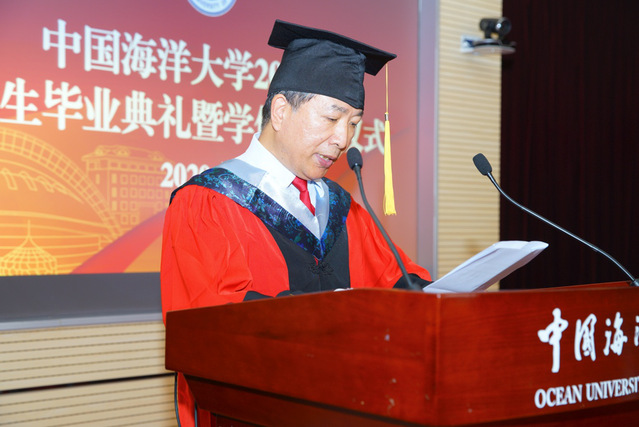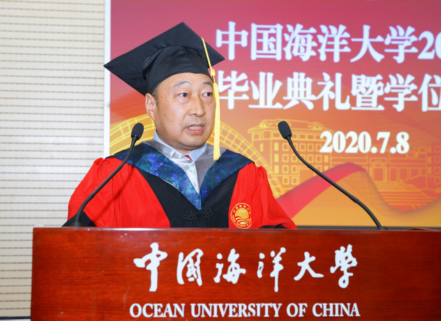 数学科学学院朴大雄教授代表全体教师致辞。他表示,在疫情面前,我们共同见证了社会制度的优越性和国民的高素质。希望大家作为海大的毕业生,有所作为,自信自强自豪地走在时代的前列。基础数学专业2017级硕士研究生李金楠,信息与计算科学专业2016级本科生、国防生潘庆涛代表全体毕业研究生表达了对母校的感激和惜别之情。
