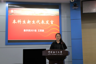 2021级数学类专业王思颖代表本科生新生发言,她首先表达了踏入校园的欣喜与憧憬。大学时代是人一生中的黄金时期,是一个人步入社会的过渡时期,是人生观,世界观成熟的重要时期。身为二十一世纪的新青年与海大人,同学们是新一批年轻的力量,肩负着国家发展的重担。作为数学界的种子选手,更应当以扬帆之势,奔向远方!