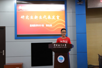 2021级应用数学专业邹永辉代表研究生新生发言,“凡是过去,皆为序章”,来到海大便意味着新的开始。研究生与本科生的学习生活是有很大不同的,他提醒在座的研究生新生规划自己的生活,先走好第一步。正如习近平总书记所说:“要系好人生第一粒扣子,走好人生道路。”他祝愿大家在海大数院拥抱机遇,迎接挑战,以坚韧不拔的意志乘风破浪,以心系天下的情怀让青春远航!
