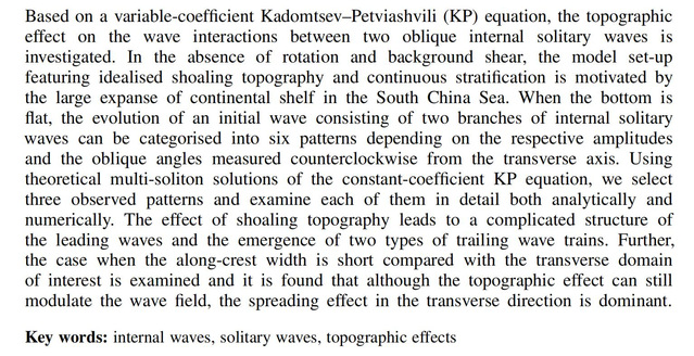 上述论文,在海洋实际的连续层化背景下,借助变系数Kadomtsev-Petviashvili (KP)方程研究了海底变化地形对海洋内孤立波间波-波相互作用的影响。借助理论分析结果,将初始V形內波的演化情景划分为6种情景,结合海洋卫星遥感数据,分析了其中3种目前已被观测记录的情形,数值模拟结果呈现了波-波相互作用发生后奇异的波形和振幅分布,表明海底地形不仅会调制波动的振幅和波形,特定情形下,还会影响到波-波相互作用的演化情景。不过,KP方程要求在横向上的变化要比传播方向上弱一个数量级,这在某些情形下限制了它的应用,为此课题组结合哈密尔顿动力系统和渐进分析方法推导了各向同性的modified Benney-Luke (mBL)方程,成果发表在海洋数值模拟主流期刊《Ocean Modelling》上。目前,课题组正在应用最新的mBL方程研究波-波相互作用。