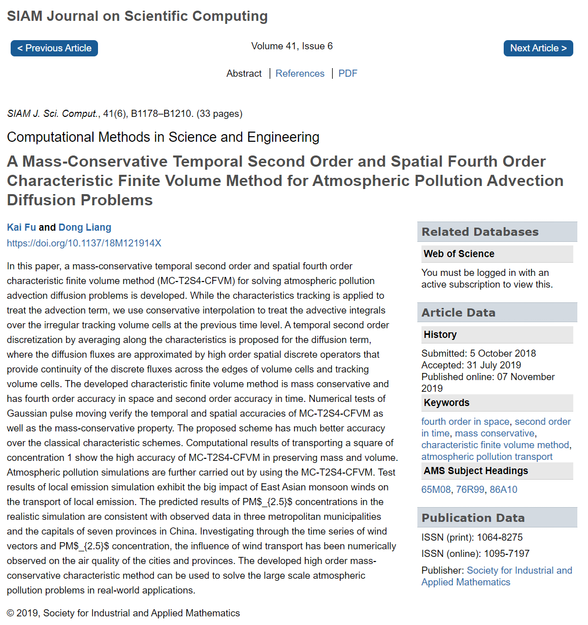 开云电竞网址数学科学学院教师付凯博士与合作者在计算数学期刊《SIAM Journal on Scientific Computing》上发表了题为“A Mass-Conservative Temporal Second Order and Spatial Fourth Order Characteristic Finite Volume Method for Atmospheric Pollution Advection Diffusion Problems”的研究文章。