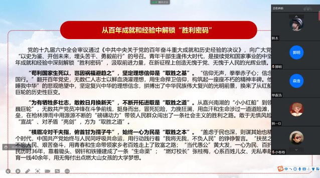 在理论宣讲实践活动中,数学学子“回顾百年历程,传承新时代精神”调研团采用了线上宣讲的方式,深入人民群众,将学习党的历史与讲述党的故事相结合,开展了小规模、有特色、接地气的宣讲活动。宣讲中,采用了多元的宣讲方式,成员学生双互动,宣讲以演讲、观看红色电影、分享“读懂新时代”丛书等方式展开,组织学生进行“讲好红色故事”等活动,树立了学生的使命感。