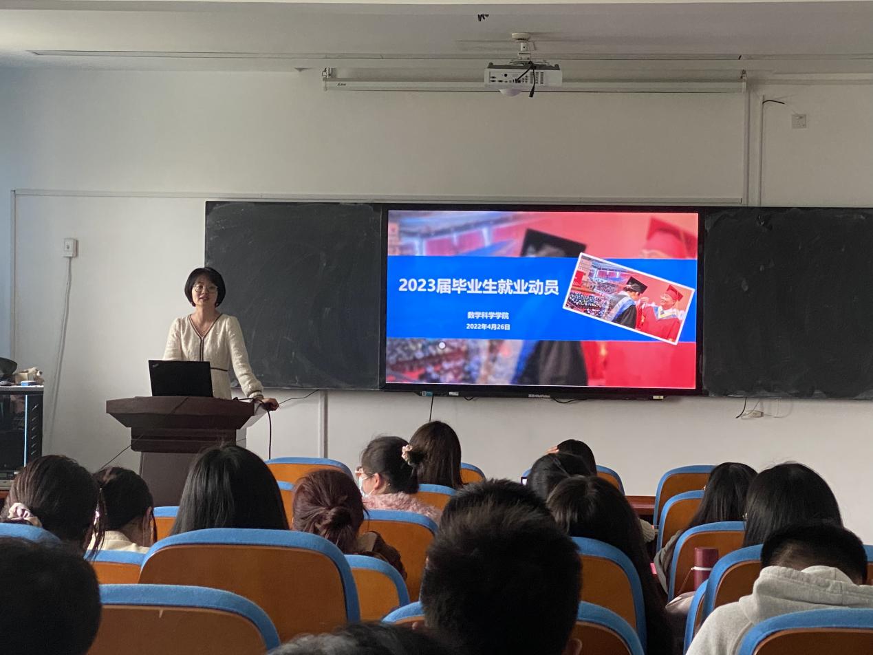4月26日下午,数学科学学院在院楼604教室举行2023届毕业生科研、就业指导动员会。本次会议由学院副院长王卫国、团委老师律海伦担任主讲,2019级硕士李燕燕、毕明超、姜枚、杨怡在会上分享经验,2020级硕士全体学生参加。