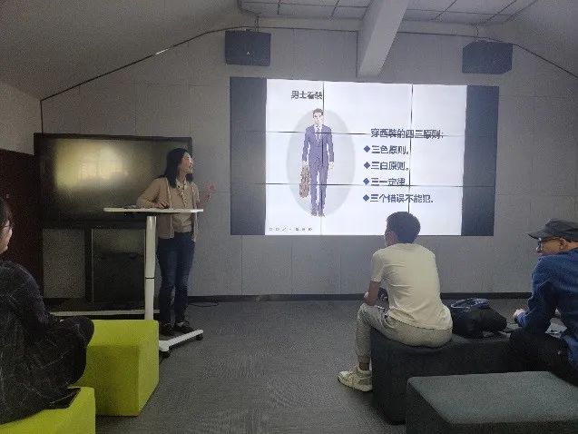 在课程的第一部分,王老师分别讲解了男士和女士的着装礼仪,现场同学们与王老师积极互动,同学们纷纷表示学习到了在各种场合穿衣的不同,并更加意识到了职场上着装的重要性;
