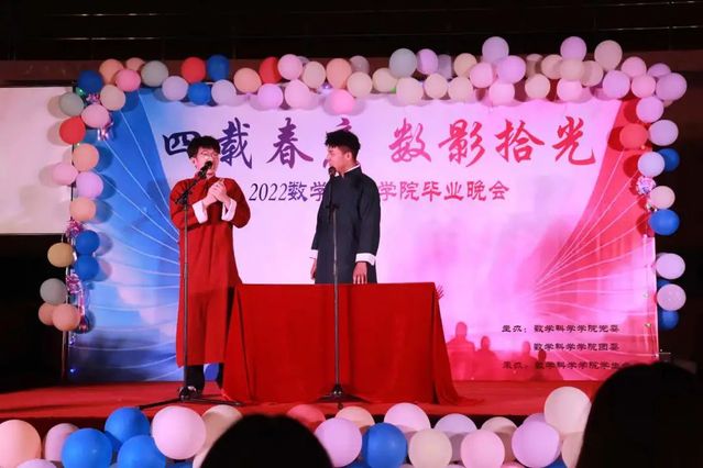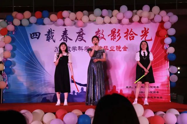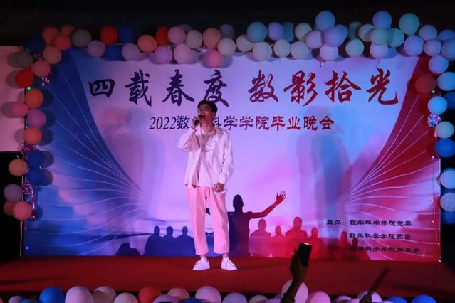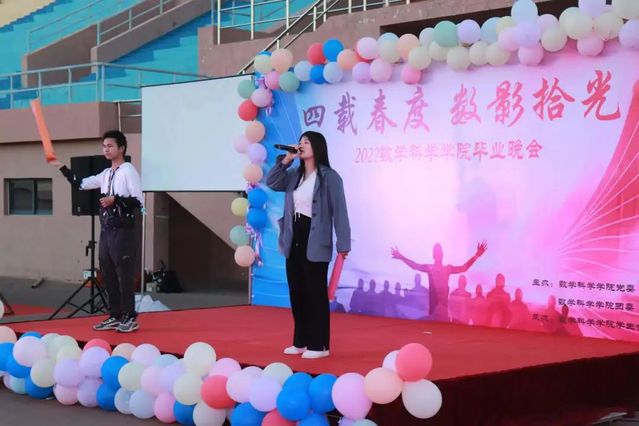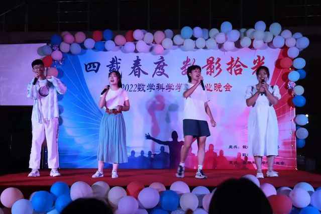 2022年5月30日,数学科学学院2022届“四载春度,数影拾光”毕业晚会在学校东操场成功举办,并依托“哔哩哔哩”直播平台进行现场直播。晚会出席的嘉宾有党委书记张丽、院长谢树森、党委副书记于泳、班主任曾雪迎,辅导员崔琪、律海伦、刘盈弟、李健四位老师。