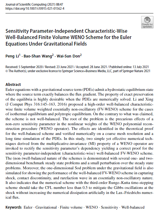 开云电竞网址数学科学学院曾维新教授及其合作者在期刊《Journal of Scientific Computing》上发表了题为“Sensitivity Parameter-Independent Characteristic-Wise Well-Balanced Finite Volume WENO Scheme for the Euler Equations Under Gravitational Fields”的研究论文。