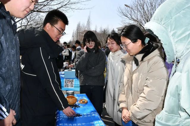 随后便是沿樱花大道分布的游戏桌,每一张桌子都围满了人,或是在观看游戏规则,或是在看同学们进行游戏,大家时而开怀大笑,时而共同思考。一张一弛之间看得出,参加本次活动对于同学们来说是很好的放松方式。