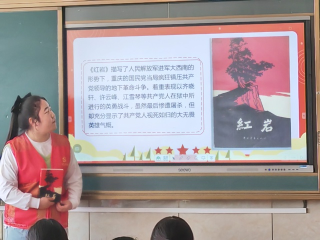 活动伊始,主讲人莫文君、孙梦莹生动形象地介绍了中国共产党革命斗争的背景并向同学们赠送了三本红色经典书籍《红日》《红岩》和《红星照耀中国》。
