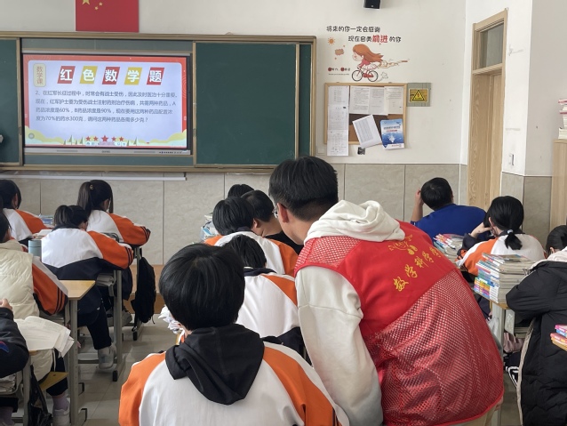 最令同学们期待的是红色知识问答环节。同学们热情高涨、积极踊跃地与主讲人互动,运用所学知识解决了一道又一道红色背景的数学题,他们讲述着自己对革命精神的认识,对爱国主义的追求,抒发着新时代青年的爱国热情。