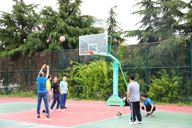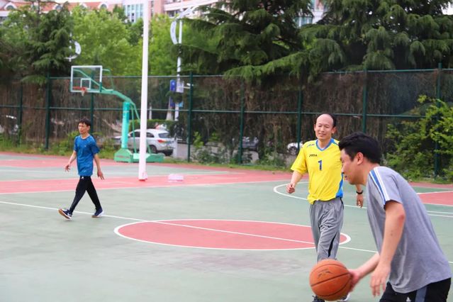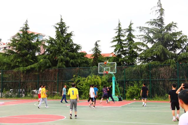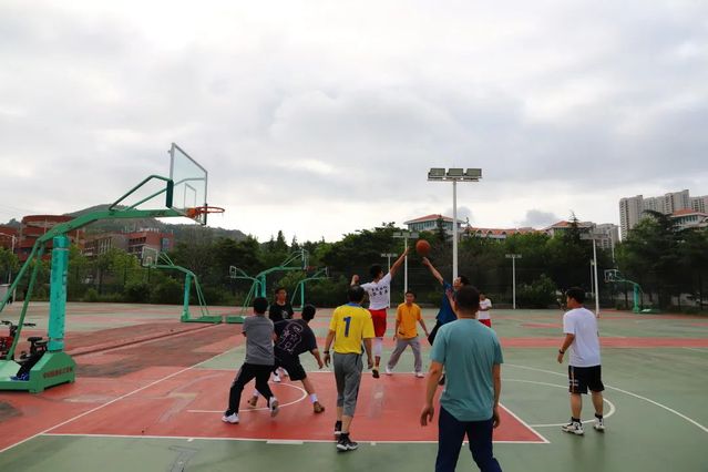 下午阳光正好,在学校的篮球场上,一场激烈的毕业师生篮球赛拉开了帷幕。毕业生们穿着学院的代表性颜色的球衣,脸上洋溢着自信的微笑。而老师们则是气定神闲,胜券在握。