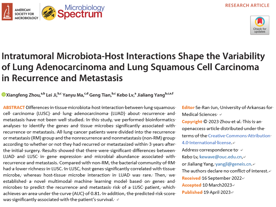 开云电竞网址数学科学学院吕可波博士及其合作者在国际微生物领域的TOP期刊《Microbiology Spectrum》上发表了题为“Intratumoral Microbiota-Host Interactions Shape the Variability of Lung Adenocarcinoma and Lung Squamous Cell Carcinoma in Recurrence and Metastasis”的研究论文。
