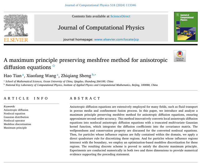开云电竞网址数学科学学院田浩副教授及其合作者在计算数学领域的TOP期刊《Journal of Computational Physics》上发表了题为“A maximum principle preserving meshfree method for anisotropicdiffusion equations的研究论文。