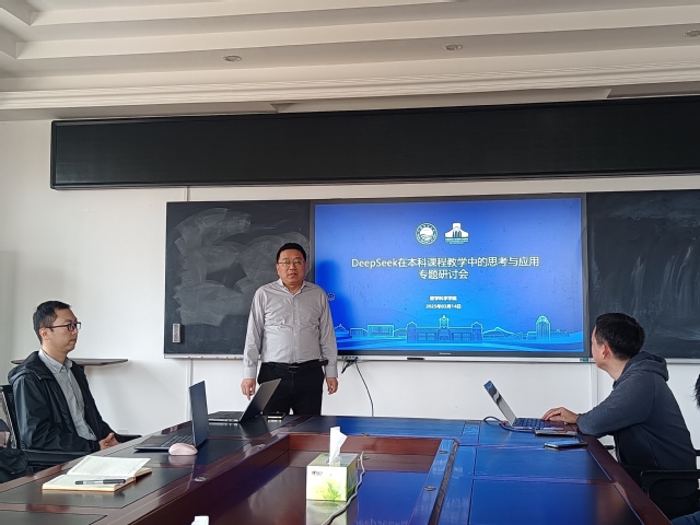 为深入探索人工智能技术在高等数学教学中的创新应用,提升公共基础课教学质量,数学科学学院于2025年3月14日在数学楼424会议室举办了“DeepSeek在本科课程教学中的思考与应用”专题研讨会。会议由副院长王建主持,高等数学和大学数学课程教师参加了此次研讨。