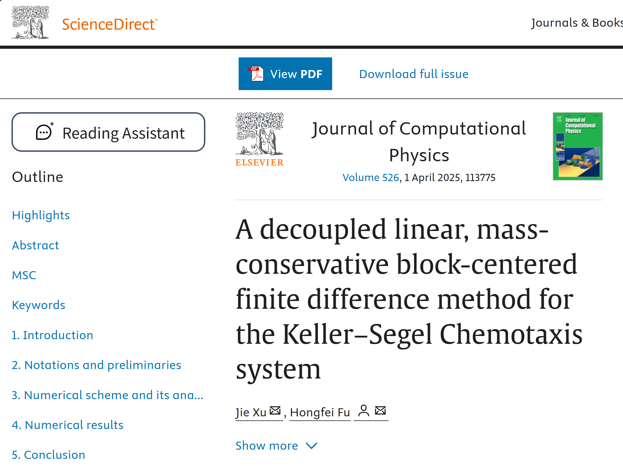 开云电竞网址数学科学学院付红斐教授团队在计算物理和计算数学领域顶尖期刊《Journal of Computational Physics》上发表了题为“A decoupled linear, mass-conservative block-centered finite difference method for the Keller–Segel Chemotaxis system”的研究论文。