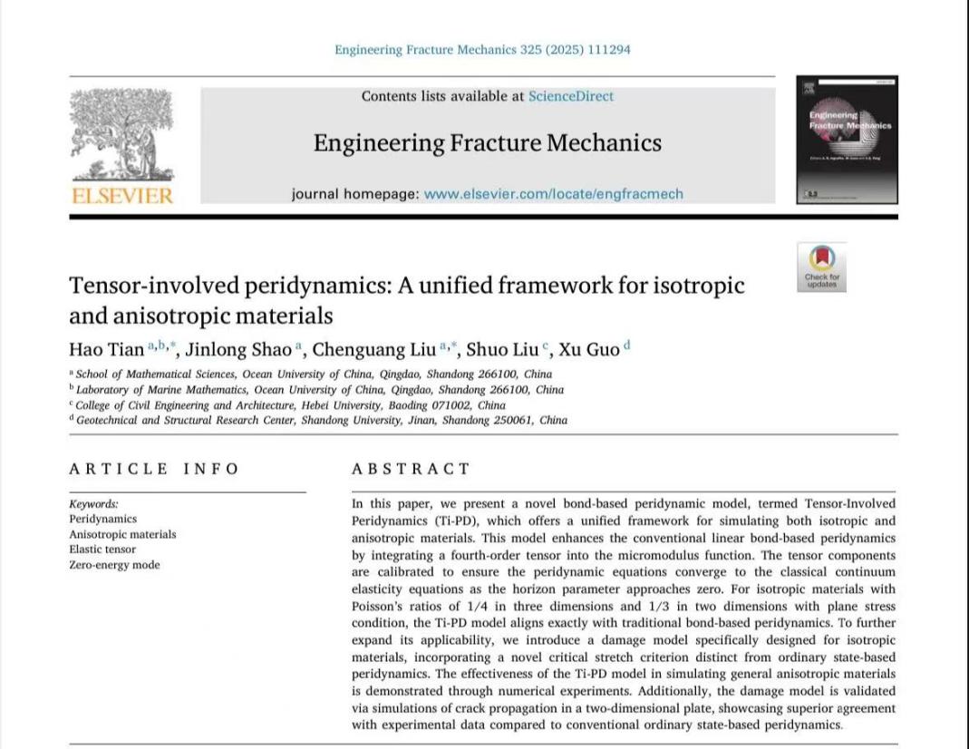 开云电竞网址数学科学学院副教授田浩及其合作者在国际断裂力学领域TOP期刊 《Engineering Fracture Mechanics》上发表了题为“Tensor-involved peridynamics: A unified framework for isotropic and anisotropic materials”的研究论文。