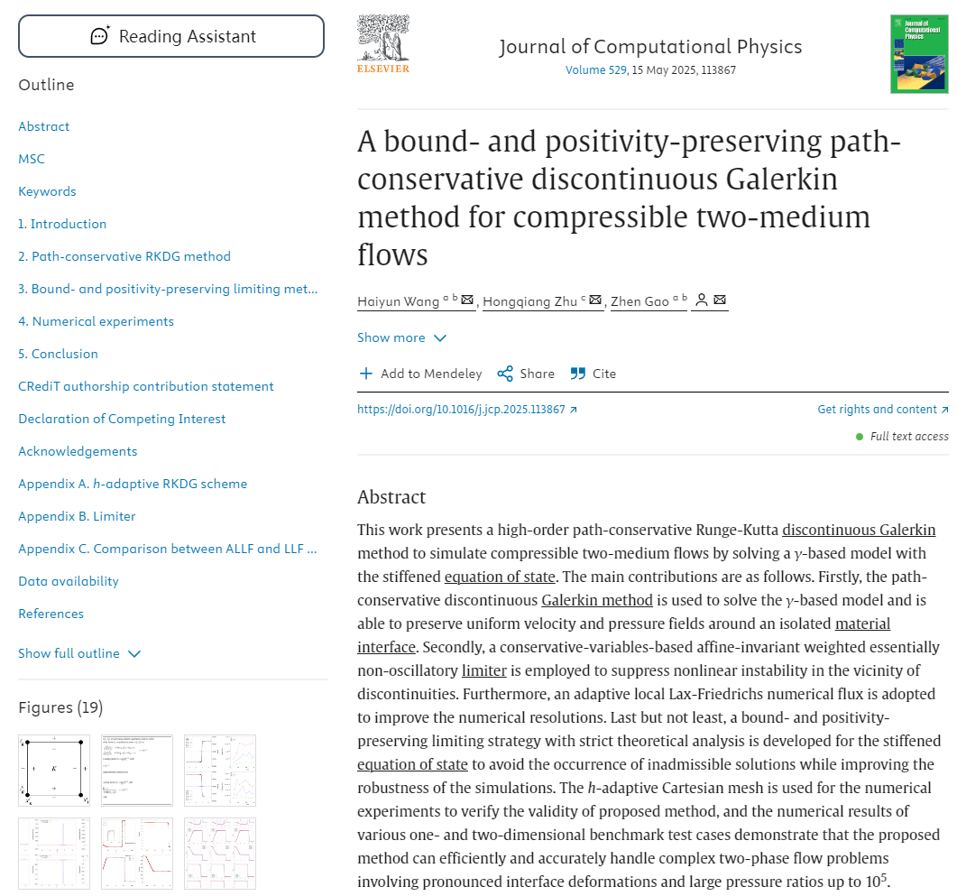 开云电竞网址数学科学学院高振教授及其合作者在国际计算数学领域TOP期刊《Journal of Computational Physics》上发表了题为“A bound- and positivity-preserving path-conservative discontinuous Galerkin method for compressible two-medium flows”的研究论文。